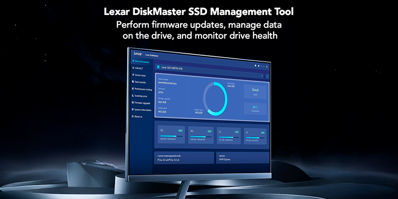 Để quản lý hiệu quả ổ cứng của mình, người dùng có thể sử dụng phần mềm Lexar DiskMaster SSD Management. Công cụ này hỗ trợ cập nhật firmware mới, theo dõi sức khỏe ổ đĩa, kiểm tra nhiệt độ, hiển thị dung lượng còn lại và xóa dữ liệu an toàn (secure erase) để bảo vệ thông tin cá nhân. Tính năng này đặc biệt hữu ích cho những ai sử dụng ổ cứng trong môi trường chuyên nghiệp hoặc cần đảm bảo tính riêng tư của dữ liệu quan trọng, đồng thời góp phần nâng cao độ bền cho ổ đĩa trong dài hạn.