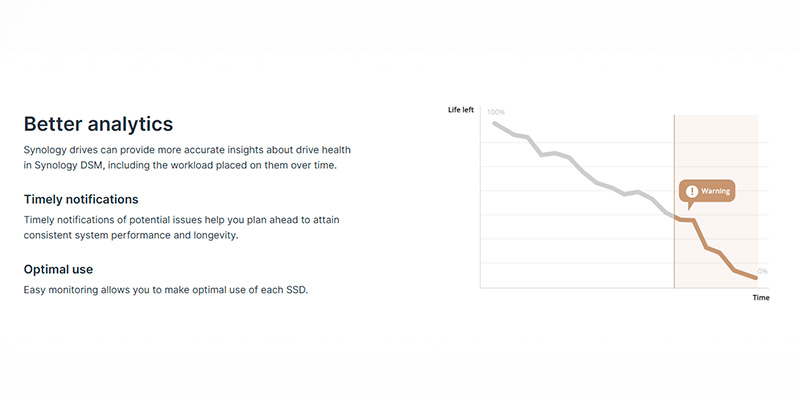 Một điểm nổi bật khác của SSD Synology Enterprise Series SNV5400 400GB PCIe Gen3 x4 NVMe M.2 SNV5420-400G chính là khả năng tích hợp sâu với hệ điều hành DiskStation Manager (DSM). Nhờ firmware được tinh chỉnh bởi Synology, thiết bị hoạt động mượt mà và đồng bộ với các công cụ quản lý của DSM như Storage Manager và Active Insight. Điều này giúp người dùng theo dõi tình trạng SSD, tuổi thọ, nhiệt độ và hiệu năng một cách trực quan, dễ dàng phát hiện và xử lý lỗi trước khi xảy ra mất mát dữ liệu. Đây là tính năng mà ít thương hiệu SSD khác trên thị trường có thể cung cấp, đặc biệt là trong môi trường doanh nghiệp cần giám sát hệ thống toàn diện.