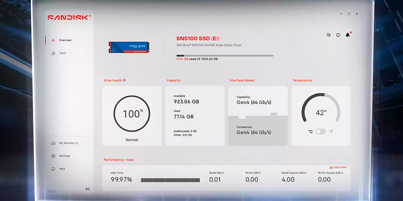 Western Digital trang bị cho SN5100 hai công cụ phần mềm độc quyền: Acronis True Image for SanDisk và SanDisk Dashboard. Người dùng có thể sao lưu, di chuyển dữ liệu và giám sát tình trạng ổ dễ dàng. Acronis giúp chuyển dữ liệu từ ổ cũ sang SSD mới nhanh chóng, trong khi Dashboard cho phép kiểm tra hiệu suất, nhiệt độ, phiên bản firmware và tình trạng sức khỏe ổ cứng theo thời gian thực. Đây là giải pháp hoàn chỉnh giúp người dùng quản lý hệ thống hiệu quả, an toàn và chuyên nghiệp hơn.