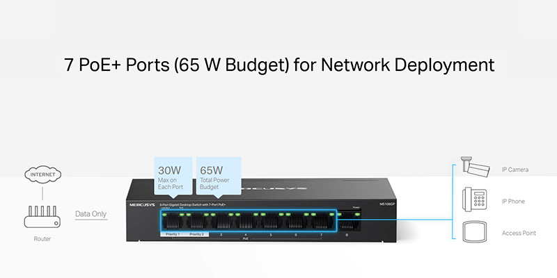 Switch Mercusys 8 Port PoE+ 10/100/1000 Mbps MS108GP trang bị 7 cổng hỗ trợ công nghệ PoE+ (Power over Ethernet), giúp cấp nguồn trực tiếp cho các thiết bị như camera IP, điện thoại VoIP, điểm truy cập Wi-Fi mà không cần bộ chuyển đổi điện riêng biệt. Mỗi cổng PoE+ có thể cung cấp tối đa 30W, tổng công suất của switch lên đến 65W, đảm bảo đáp ứng nhu cầu sử dụng linh hoạt của nhiều thiết bị mạng cùng lúc.