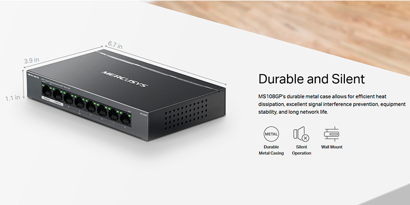 Switch Mercusys 8 Port PoE+ 10/100/1000 Mbps MS108GP được thiết kế với vỏ kim loại chắc chắn, giúp tăng khả năng tản nhiệt, đảm bảo thiết bị hoạt động ổn định trong thời gian dài. Với thiết kế không quạt, switch vận hành êm ái, không gây tiếng ồn, phù hợp với các không gian làm việc cần sự yên tĩnh như văn phòng, phòng họp hoặc hệ thống giám sát gia đình.