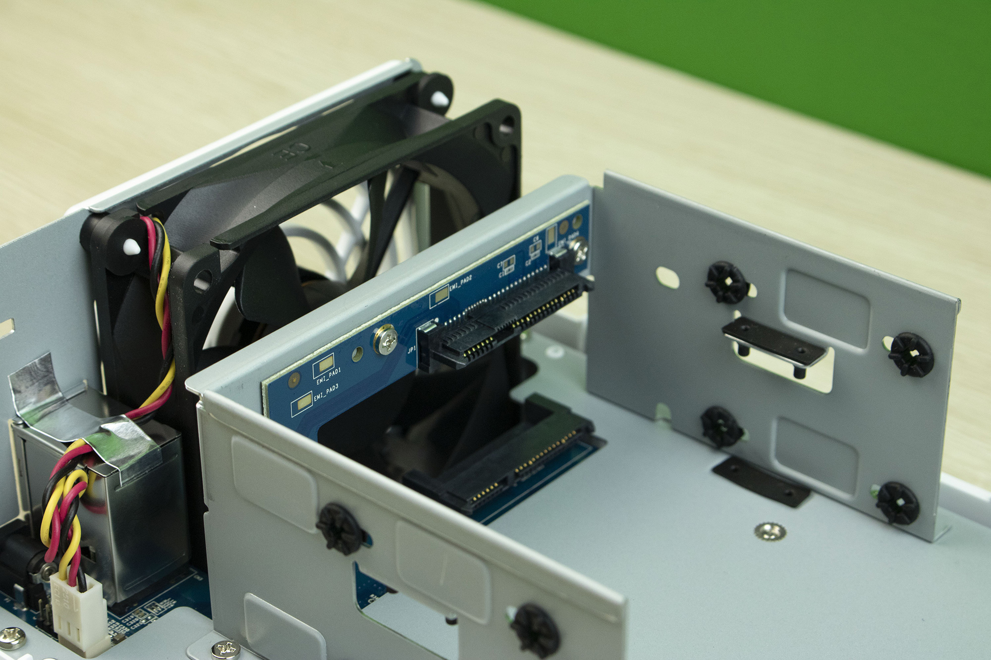Bên trong với thiết kế đơn giản với bộ khung cứng cáp gồm 2 khay gắn ổ cứng, cổng SATA, bảng mạch kèm vi xử lý, bộ nhớ RAM và quạt tản nhiệt với kích thước 92 x 92 x 25 (mm). |