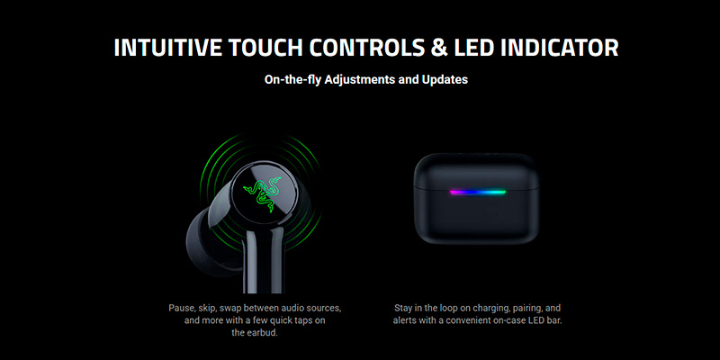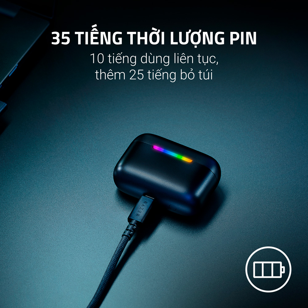 Không cần phải loay hoay mở khóa điện thoại hay thoát ra khỏi ván game đang gay cấn, Razer đã tích hợp bề mặt cảm ứng cực nhạy ngay trên bề mặt tai nghe. Nhờ tính năng điều khiển qua thao tác chạm, bạn có thể tự do phát/tạm dừng nhạc, chuyển bài, nhận/từ chối cuộc gọi hay kích hoạt trợ lý ảo chỉ bằng những cú chạm nhẹ nhàng lên housing. Điểm xuyết trên thiết kế đen nhám là hệ thống đèn LED thông báo mang đậm DNA gaming của "Rắn xanh" Razer. Dải đèn LED này không chỉ giúp thiết bị trông ngầu hơn mà còn hiển thị trực quan trạng thái ghép nối Bluetooth và tình trạng pin, giúp bạn luôn nắm thế chủ động trong mọi tình huống sử dụng.