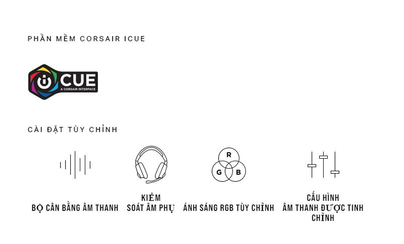Phần mềm iCUE Phần mềm iCUE cho phép điều khiển tai nghe của bạn với cấu hình âm thanh được cài đặt sẵn trước. Cài đặt bộ cân bằng tùy chỉnh, âm thanh 7.1 Surround và điều khiển âm thanh phụ. Tùy chỉnh ánh sáng RGB của bạn. |