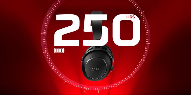 Điểm nổi bật của HyperX Cloud Alpha 2 Wireless chính là viên pin siêu bền, cho thời lượng lên đến 250 giờ ở chế độ 2.4GHz hoặc 125 giờ khi sử dụng song song cùng Bluetooth. Với thời gian sạc chỉ 6 giờ, tai nghe mang đến trải nghiệm liên tục nhiều ngày mà không cần lo gián đoạn. Đây là thời lượng pin gấp đôi so với các mẫu tai nghe gaming không dây cùng phân khúc, giúp người dùng yên tâm cho những phiên chơi game hay làm việc kéo dài. Pin dung lượng lớn là lợi thế vượt trội để bạn luôn sẵn sàng trong mọi tình huống.