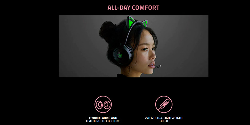 Với trọng lượng chỉ 270g, Razer Kraken Kitty V3 X mang lại cảm giác cực kỳ nhẹ nhàng và thoải mái ngay cả khi sử dụng trong nhiều giờ liên tục. Phần đệm tai memory foam kết hợp da PU và vải thoáng khí giúp cách âm hiệu quả, đồng thời giảm áp lực lên tai, cho phép bạn tập trung hoàn toàn vào trận đấu hoặc buổi phát sóng. Thiết kế khung tai nghe linh hoạt, ôm sát đầu giúp cố định chắc chắn mà không gây đau hay mỏi cổ.