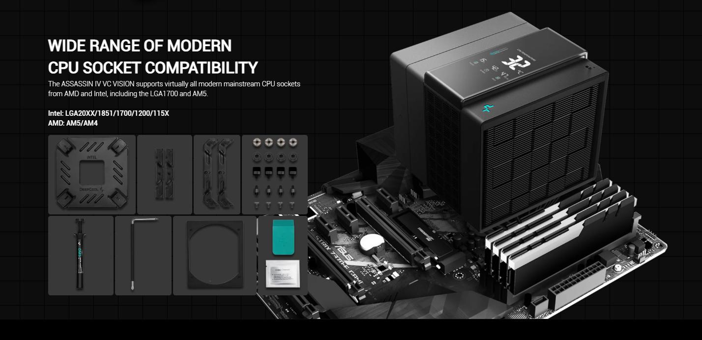 Điểm bổ sung nổi bật của ASSASSIN IV VC VISION là màn hình digital nâng cao giúp theo dõi nhiệt độ, mức sử dụng, công suất và tần số CPU của bạn. Bảng digital được nhiễm từ nên việc lắp đặt và điều chỉnh cực kỳ đơn giản. Màn hình được điều khiển thông qua phần mềm DeepCool và chỉ yêu cầu đầu cắm USB 2.0 Header.