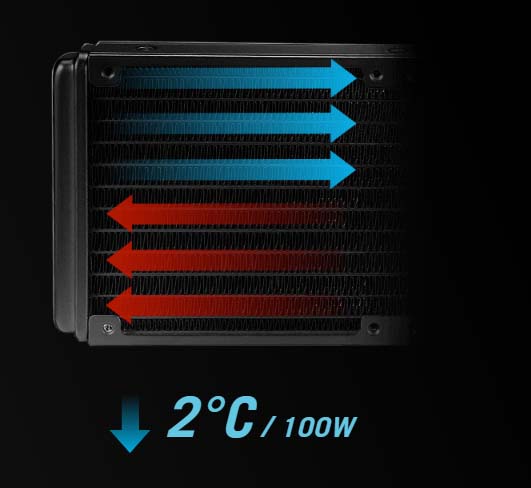 Radiator cải tiến Chất làm mát được chuyển đến bộ tản nhiệt, cứ mỗi 100 Watt tải sẽ hỗ trợ giảm nhiệt độ hơn 2 độ C so với thiết kế thế hệ trước. |