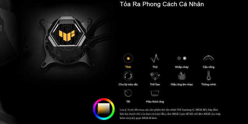 Tản nhiệt nước AIO Asus TUF LC 240 ARGB mang đến một loạt màu sắc rực rỡ cùng kiểu dáng đẹp cho trái tim dàn máy của bạn. Quạt tản nhiệt và logo TUF Gaming trên vỏ bơm tỏa sáng với hệ thống đèn Aura ARGB, màu sắc và hiệu ứng có thể tùy chỉnh để phù hợp với hệ thống của bạn, vì vậy bạn có thể tạo ra một giao diện thống nhất hoàn toàn mang dấu ấn của riêng mình
