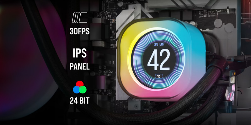 Tản nhiệt nước AIO Corsair iCUE LINK H150i LCD trang bị màn hình IPS LCD 2,1" tùy chỉnh với độ phân giải 480x480 và đèn nền 600cd/m2 siêu sáng hiển thị nhiệt độ CPU theo thời gian thực, ảnh GIF, meme hài hước nhất hoặc logo của nhóm ở tốc độ 30 FPS với hơn 16,7 triệu màu.