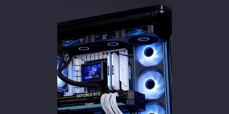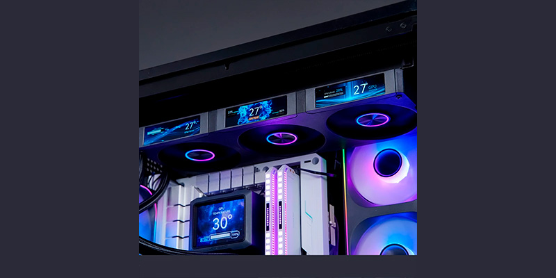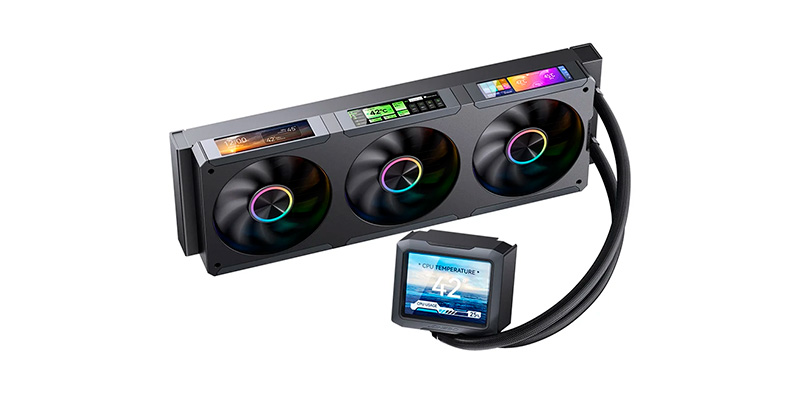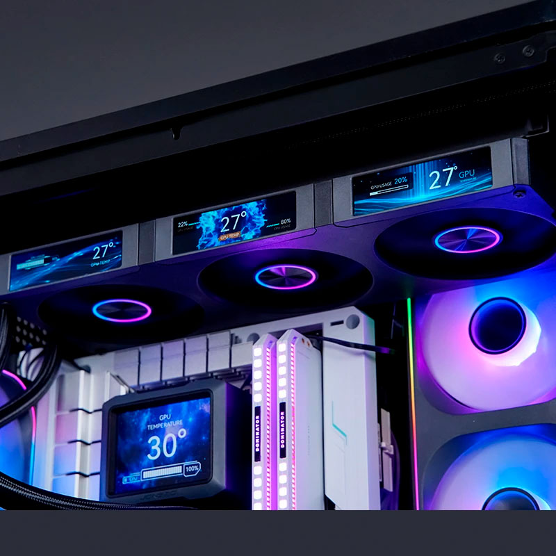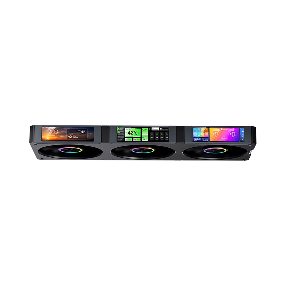 Bộ quạt đi kèm có kích thước 363.8 x 130 x 28mm, sử dụng vòng bi kép bền bỉ, hoạt động trong dải tốc độ 700 – 2400 vòng/phút (±10%). Với lưu lượng gió 21,46 – 62,40 CFM, hệ thống quạt mang đến luồng gió mạnh mẽ, duy trì nhiệt độ CPU ổn định. Độ ồn chỉ từ 21,3 – 37,3 dB(A), cân bằng giữa hiệu suất và độ yên tĩnh. Ngoài ra, quạt hỗ trợ ARGB 3 pin và LCD USB, mang lại khả năng đồng bộ ánh sáng ấn tượng trong dàn PC.