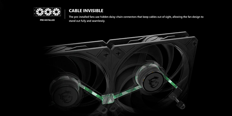 Trang bị tới 3 quạt 120mm có tốc độ quay từ 500~2050 ±150 RPM, với luồng gió lên đến 64.89 CFM, sử dụng vòng bi Rifle Bearing tăng độ bền và tuổi thọ lên tới 40.000 giờ ở 40°C. Quạt hoạt động yên tĩnh, độ ồn tối đa chỉ 28.7 dBA, phù hợp với không gian làm việc và chơi game cần sự yên tĩnh.