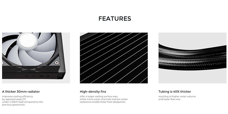 Radiator của TRYX Panorama có độ dày lên đến 30mm, lớn hơn so với tản tiêu chuẩn, kết hợp cùng mật độ cánh tản nhiệt cao, tăng diện tích tiếp xúc không khí và giảm trở kháng dòng nước, giúp truyền tải và tản nhiệt tốt hơn. Ống dẫn nước của sản phẩm dày hơn 40% so với thế hệ cũ, cho lưu lượng nước lớn hơn, giảm áp lực bơm và giúp làm mát nhanh hơn. Tổng thể hệ thống được tối ưu từ thiết kế đến cấu trúc để phục vụ các CPU cao cấp như Intel Core i9, Ryzen 9 hay những người dùng có nhu cầu ép xung.
