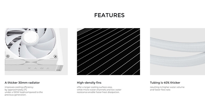 Radiator của TRYX Panorama có độ dày lên đến 30mm, lớn hơn so với tản tiêu chuẩn, kết hợp cùng mật độ cánh tản nhiệt cao, tăng diện tích tiếp xúc không khí và giảm trở kháng dòng nước, giúp truyền tải và tản nhiệt tốt hơn. Ống dẫn nước của sản phẩm dày hơn 40% so với thế hệ cũ, cho lưu lượng nước lớn hơn, giảm áp lực bơm và giúp làm mát nhanh hơn. Tổng thể hệ thống được tối ưu từ thiết kế đến cấu trúc để phục vụ các CPU cao cấp như Intel Core i9, Ryzen 9 hay những người dùng có nhu cầu ép xung.