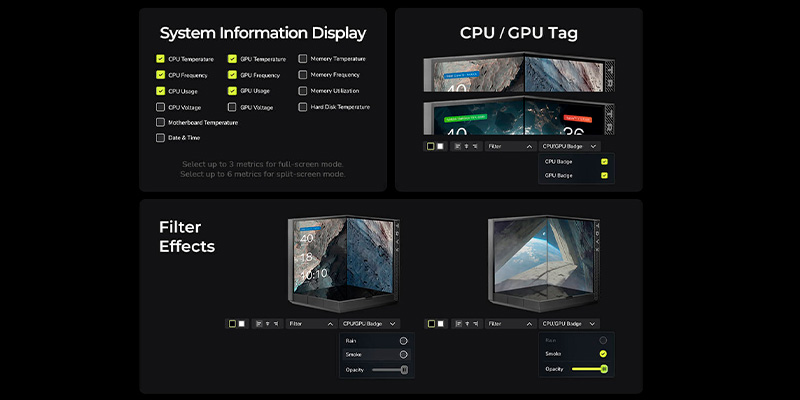 Màn hình kép 4.3 inch IPS của sản phẩm có thể hiển thị đa dạng nội dung, từ các thông số kỹ thuật của hệ thống như nhiệt độ CPU, tốc độ quạt, xung nhịp... cho đến các hình ảnh, video (GIF/MP4) cá nhân hóa do người dùng tải lên. Độ phân giải cao và màu sắc rực rỡ giúp mọi nội dung đều sắc nét và sống động.