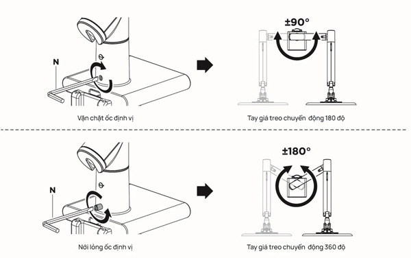 • Bước 1: Gắn phần chân đế của arm vào mặt bàn thông qua cơ chế kẹp hoặc kiểu xuyên lỗ, tùy thuộc vào lựa chọn của bạn. Thông thường, cơ chế kẹp là phổ biến và tiện lợi hơn.