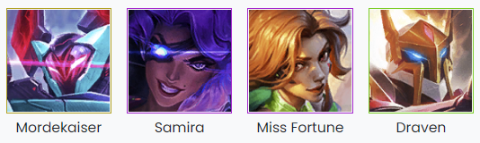 Hệ Ace trong DTCL bao gồm tướng: Draven (2 vàng), Samira (4 vàng), Miss Fortune (4 vàng), Mordekaiser (5 vàng)