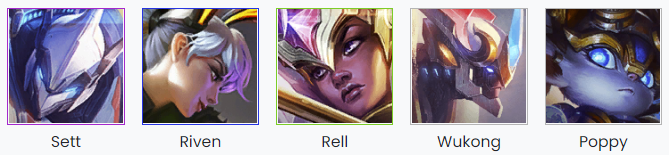Hệ Defender trong DTCL bao gồm tướng: Wukong (1 vàng), Poppy (1 vàng), Rell (2 vàng), Riven (3 vàng), Sett (4 vàng)