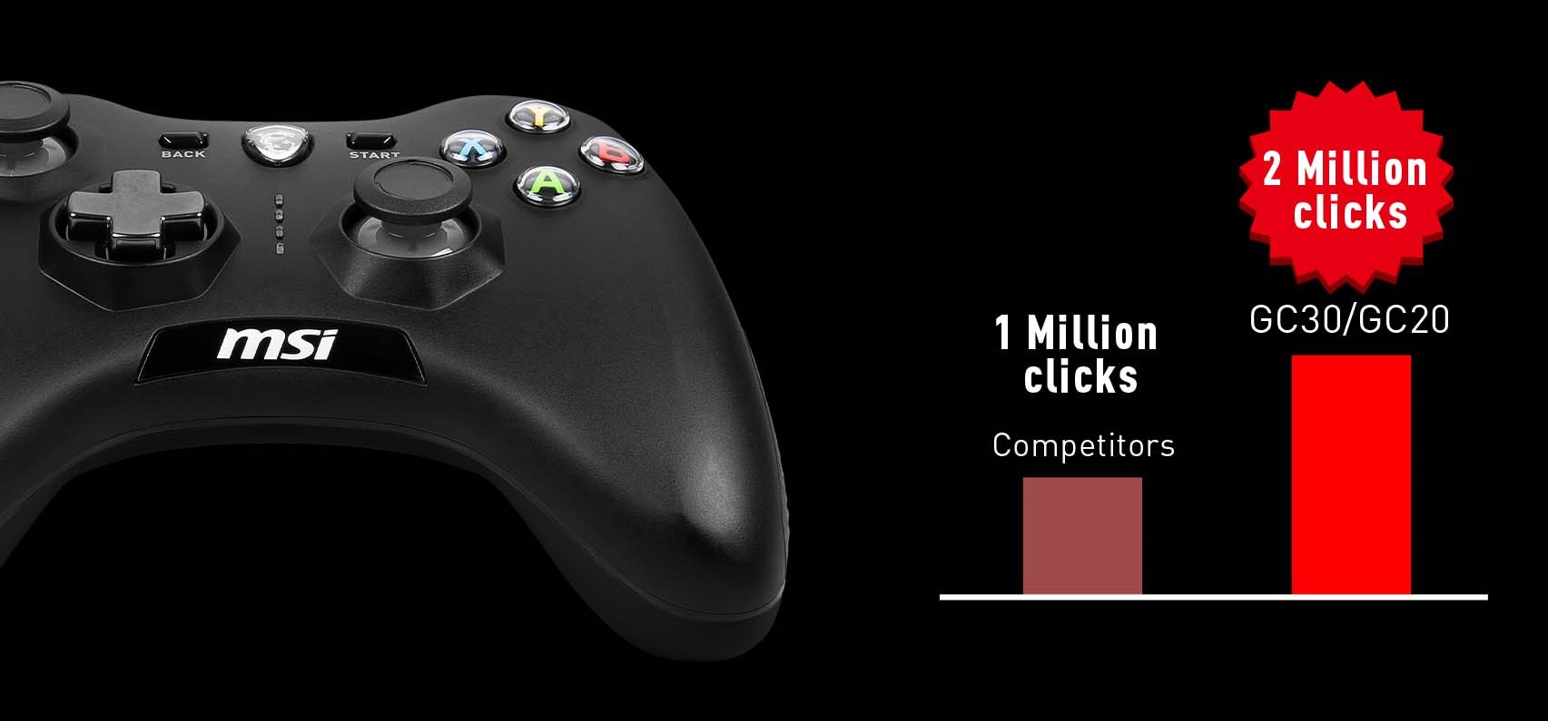Độ bền vượt trội Tay cầm không dây MSI Force GC30 V2 sử dụng switch với độ bền lên đến 2 triệu lần nhấn, vượ trội hơn các tay cầm thông thường để mang lại tuổi thọ sử dụng vượt trội. |