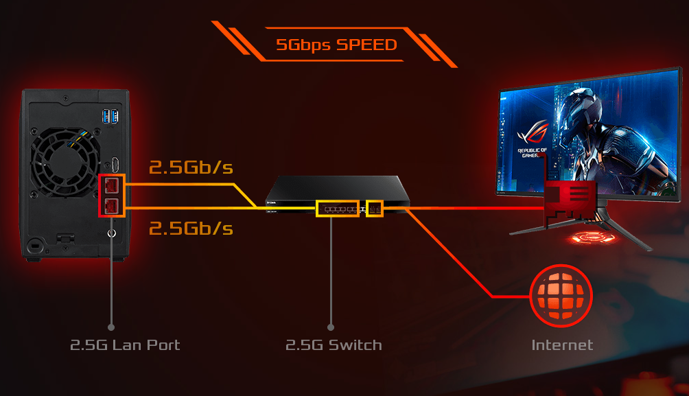Kết nối tốc độ cao Nimbustor 2 cung cấp hai cổng Ethernet 2,5-Gigabit, cho phép hiệu suất nhanh hơn tới 150% so với Gigabit Ethernet với phần cứng tương thích và lên đến 5 Gbps bằng cách sử dụng tổng hợp Liên kết. |