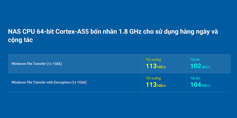 Thiết bị lưu trữ mạng NAS QNAP TS-133 được trang bị bộ vi xử lý ARM Cortex-A55 4 nhân 1.8GHz, kết hợp với 2GB RAM DDR4 giúp xử lý tốt các tác vụ đa nhiệm, đáp ứng nhu cầu lưu trữ dữ liệu, truy cập file, xem phim 4K, và quản lý các ứng dụng cá nhân một cách mượt mà, ổn định. Cấu hình này hoàn toàn phù hợp với cá nhân, gia đình và các doanh nghiệp nhỏ.