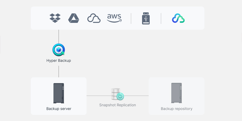 Sao lưu toàn bộ thiết bị Synology, bao gồm cài đặt hệ thống và ứng dụng hoặc chọn các thư mục cụ thể. Chuyển tất cả dữ liệu sao lưu sang nhiều đích bằng cách sử dụng Hyper Backup.