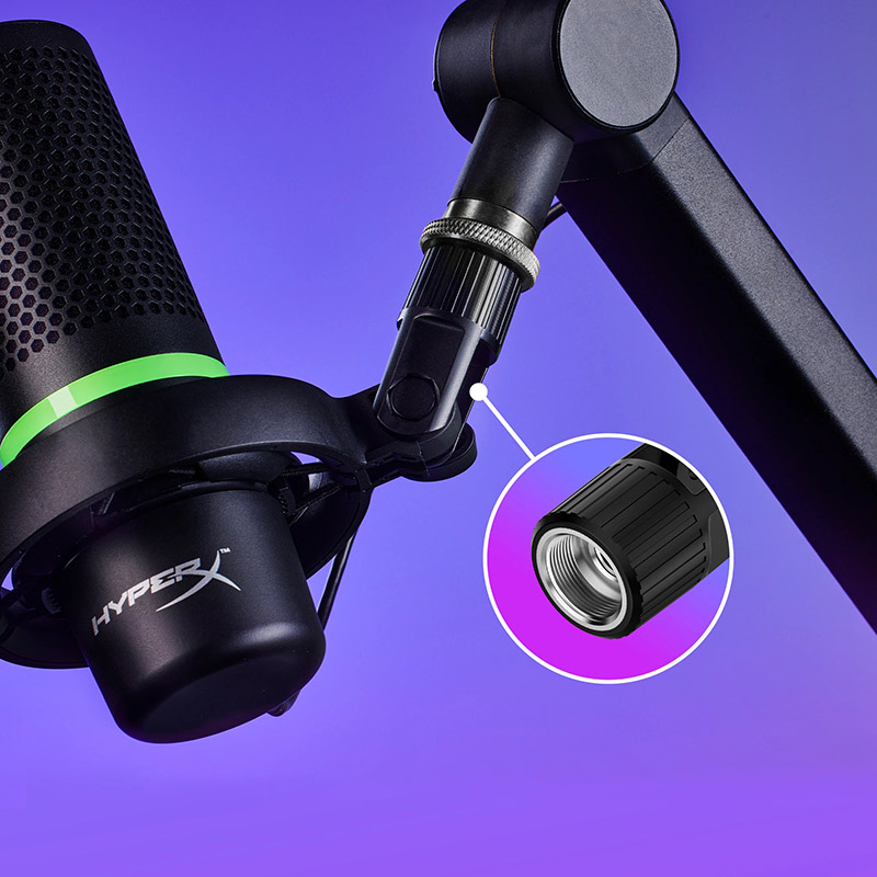 Thiết bị Stream Microphone HyperX DuoCast RGB Tích hợp đế chống sốc chống rung Micro được cố định và giảm bớt những âm thanh ầm ầm cùng va đập ngoài ý muốn bằng những dây treo đàn hồi |