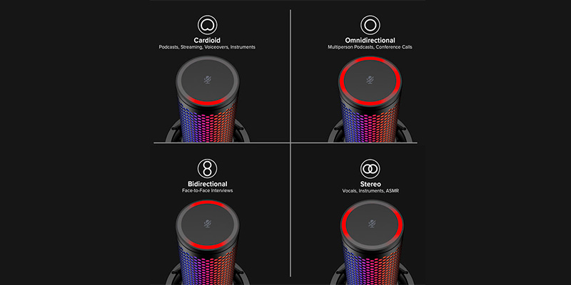 HyperX QuadCast 2 S RGB tích hợp 4 chế độ thu âm gồm Stereo, Omnidirectional, Cardioid và Bidirectional, giúp bạn linh hoạt thay đổi tùy vào nhu cầu sử dụng như thu âm giọng nói đơn, phỏng vấn, ghi âm nhạc cụ hay ghi hình nhóm. Tần số đáp ứng rộng, độ nhạy cao và khả năng tái tạo giọng nói chân thực giúp mọi bản thu đều đạt chất lượng chuyên nghiệp chỉ với thao tác cắm và dùng.
