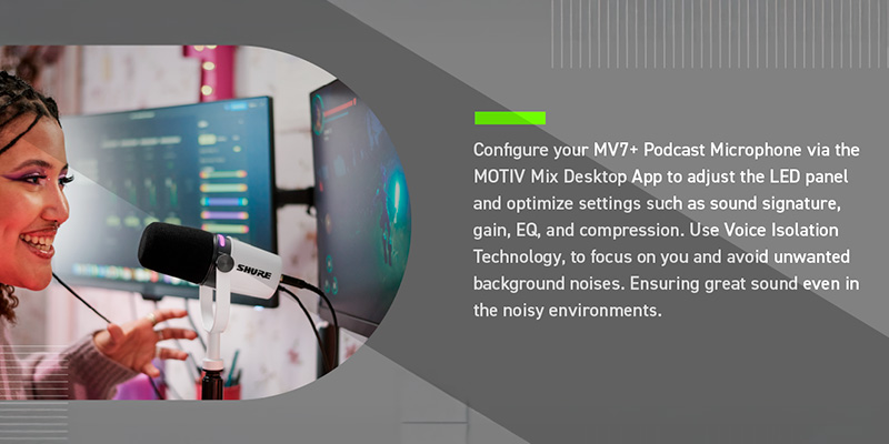 Shure MV7+ sở hữu bộ xử lý tín hiệu số (DSP) mạnh mẽ giúp giải quyết các vấn đề âm thanh phổ biến ngay trong thời gian thực. Tính năng Digital Popper Stopper™ giúp loại bỏ các âm bật hơi (plosive sounds) khó chịu khi phát âm các từ mạnh, mang lại bản ghi sạch sẽ mà không cần màng lọc pop vật lý. Đồng thời, tính năng Real-time Denoiser hoạt động hiệu quả để xử lý và loại bỏ tiếng ồn môi trường, đảm bảo bản thu của bạn luôn trong trẻo và chuyên nghiệp.