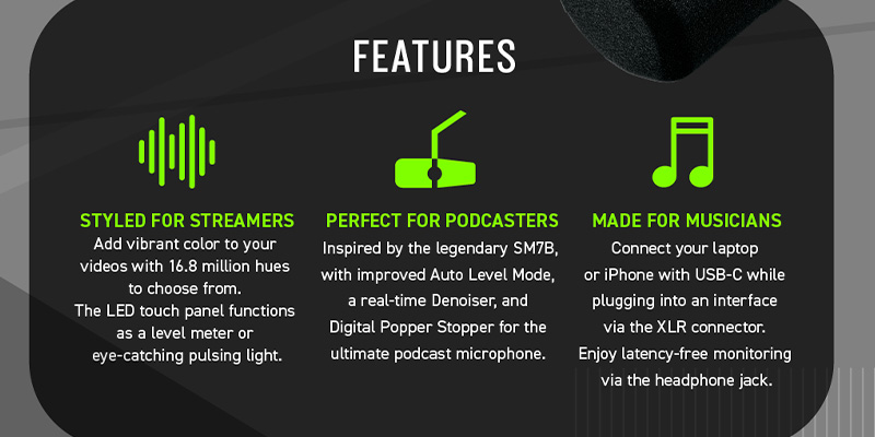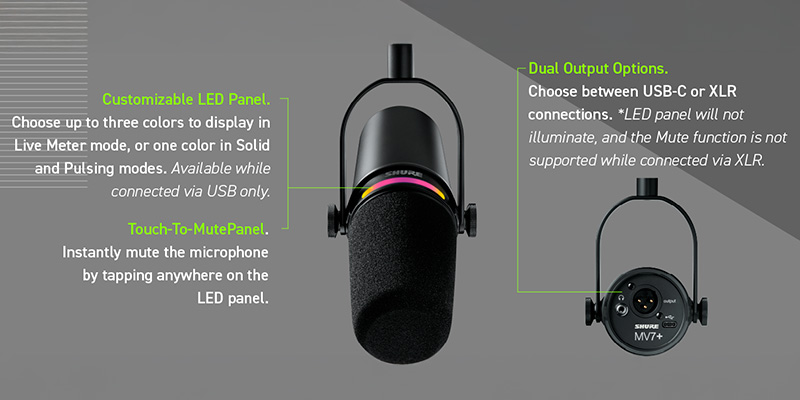 Điểm nhấn thẩm mỹ của MV7+ nằm ở bảng điều khiển cảm ứng LED Touch Panel có thể tùy chỉnh màu sắc. Bạn có thể thay đổi màu sắc của dải đèn LED để phù hợp với không gian setup của mình thông qua phần mềm. Bảng điều khiển này không chỉ hiển thị mức độ âm thanh (live metering) mà còn tích hợp tính năng chạm để tắt tiếng (touch-muting) cực kỳ tiện lợi, cho phép bạn kiểm soát mic ngay lập tức chỉ bằng một cú chạm nhẹ.