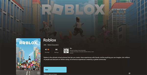 Bước 2: Trong danh sách kết quả tìm kiếm, bạn chọn ứng dụng Roblox, sau đó nhấn "Get" hoặc "Install" để bắt đầu quá trình tải và cài đặt trò chơi.