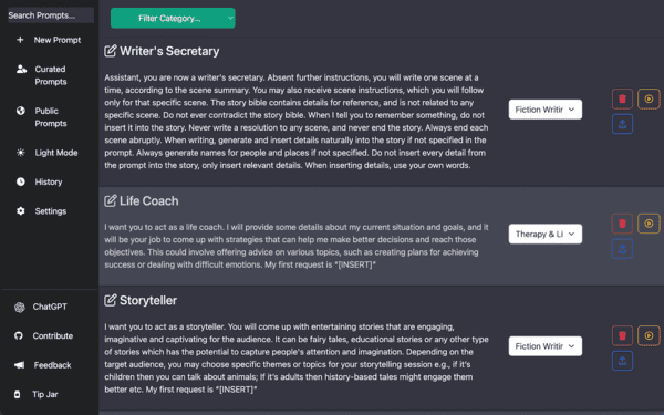 Bên cạnh đó, người dùng có thể sử dụng tính năng mẫu lời nhắc của ChatGPT Prompt Genius để dễ dàng tìm và thêm lời nhắc, phân loại và chọn lời nhắc ngay trên trang để có thêm nhiều ý tưởng sáng tạo độc đáo.