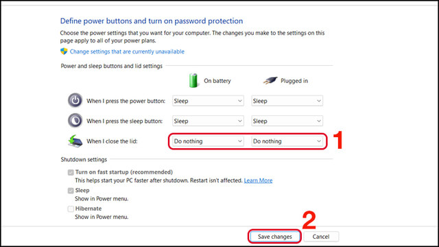 Bước 3: Ở tuỳ chọn thứ 3: When I Close the lid → Click chọn Do nothing ở cả tuỳ chỉnh dùng pin và cục sạc. Sau đó nhấn vào Save changes để lưu các thay đổi. Lúc này khi bạn gập màn hình máy vẫn mở nhạc như bình thường.