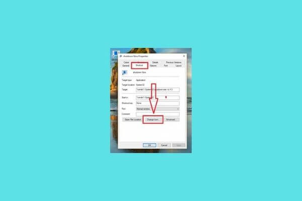 Bước 5: Chọn tiếp vào tab Shortcut → Nhấn chọn vào Change Icon…