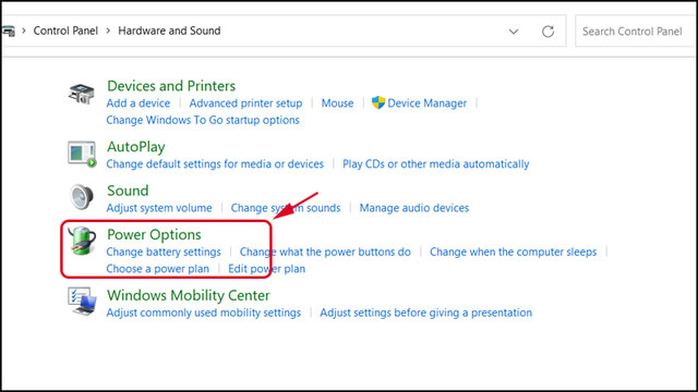 Bước 1:Nhấp vào Start → Chọn Control Panel → Hardware and Sound → Chọn tiếp vào Power Options.