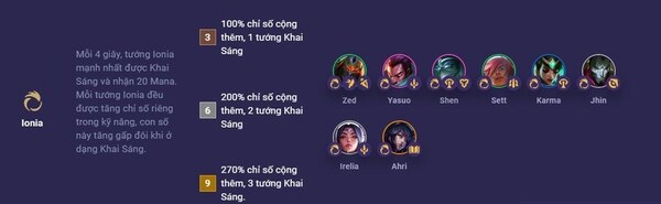 Trong mỗi 4 giây, tướng Ionia mạnh nhất sẽ được Khai Sáng và nhận 20 Mana. Đồng thời, mỗi tướng Ionia cũng được tăng chỉ số riêng trong kỹ năng của họ. Khi ở trạng thái Khai Sáng, chỉ số của tướng Ionia được tăng gấp đôi. Điều này mang đến sức mạnh và khả năng gây sát thương cao hơn cũng như chiếm ưu thế trong trận đấu.