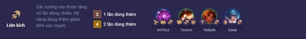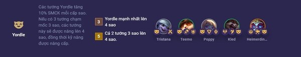 Nếu có ba tướng Yordle đạt cấp sao 3, thì tất cả ba tướng này sẽ được nâng lên cấp sao 4 và tất nhiên kỹ năng của các tướng này cũng sẽ được nâng cấp.