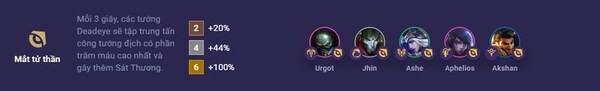 Mắt Tử Thần (2/4/6) có khả năng tăng cường tấn công và gây sát thương đặc biệt. Trong mỗi 3 giây, các tướng Deadeye sẽ tập trung tấn công tướng địch có phần trăm máu cao nhất và gây thêm sát thương.