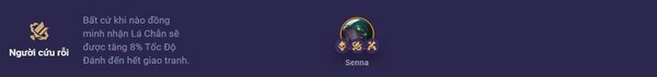 Người cứu rỗi (1) tăng Tốc Độ Đánh cho các đồng minh mỗi khi họ nhận được Lá Chắn. Điều này cho phép tất cả các đồng minh khi được bảo vệ bằng Lá Chắn sẽ được tăng 8% Tốc Độ Đánh cho đến khi giao tranh kết thúc.
