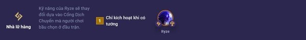 Nhà Lữ Hành (1) trong game có liên quan đến tướng Ryze. Kỹ năng của Ryze sẽ thay đổi dựa vào Cổng Dịch Chuyển mà người chơi đã bầu chọn ở đầu trận. Cổng Dịch Chuyển là các vị trí được đặt sẵn trên bản đồ, người chơi có thể chọn một trong số chúng để sử dụng khi cần thiết. Khi người chơi đã chọn Cổng Dịch Chuyển cụ thể ở đầu trận, kỹ năng của Ryze sẽ thay đổi dựa trên lựa chọn đó.