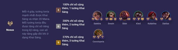 Trong DTCL mùa 9 tất cả các tướng Noxus sẽ được tăng Máu, Sức Mạnh Công Kích và Sức Mạnh Phép Thuật. Điều đặc biệt là con số này còn tăng thêm 10% cho mỗi tướng địch bị hạ gục trong giao tranh, tạo điều kiện thuận lợi cho tướng Noxus trở nên mạnh mẽ hơn qua từng cuộc chiến. Chỉ cần tiêu diệt đối thủ, tướng Noxus sẽ được cường điệu và gây sát thương mạnh hơn.