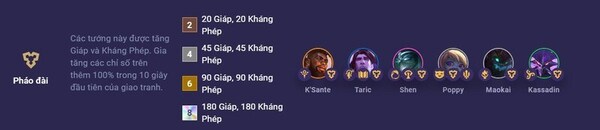 Các tướng Pháo đài (2/4/6/8) trong game sẽ được tăng cường Giáp và Kháng Phép. Trong 10 giây đầu tiên của mỗi cuộc chiến, các chỉ số này sẽ được tăng thêm 100%.
