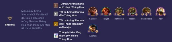 Tướng Shurima trong Đấu Trường Chân Lý có khả năng hồi phục Máu và Thăng Hoa. Mỗi 4 giây, tướng Shurima hồi 7% Máu tối đa. Sau 8 giây, bạn có thể chọn một tướng Shurima để Thăng Hoa, nhận thêm 40% Máu tối đa và 40 SMCK.