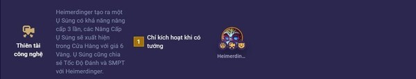 Thiên tài công nghệ (1) có khả năng tạo ra một Ụ Súng và nâng cấp đến 3 lần. Heimerdinger - tướng thuộc lớp Thiên tài công nghệ có thể tạo ra một Ụ Súng đặc biệt và sau đó nâng cấp nó để tăng cường hiệu quả của nó trong trận đấu. Ụ Súng xuất hiện trong Cửa Hàng với giá 6 Vàng và bạn có thể mua các Nâng Cấp Ụ Súng từ Cửa Hàng để nâng cấp Ụ Súng của Heimerdinger.