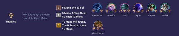 Thuật sư (2/4/6) có thể nhận thêm Mana mỗi 3 giây. Hiệu ứng này cho phép tất cả các tướng thuộc tập hợp Thuật sư nhận thêm nguồn Mana trong khoảng thời gian định kỳ 3 giây.