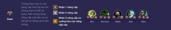 Tướng Zaun có khả năng tạo ra các nâng cấp Hóa Kỹ riêng mà chỉ những tướng đó mới có thể sử dụng. Mỗi tướng Zaun được nâng cấp Hóa Kỹ một lần và nếu muốn gỡ bỏ thì người chơi có thể bán tướng đó. Khi tướng Zaun được bán, nâng cấp Hóa Kỹ sẽ bị gỡ bỏ và không thể sử dụng nữa.