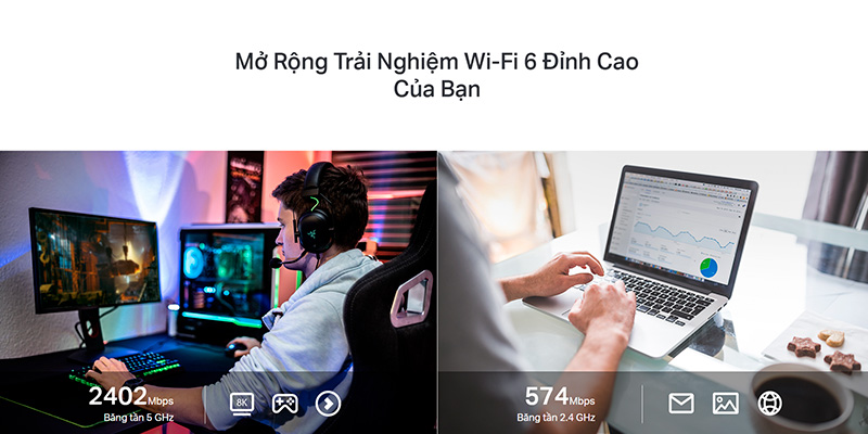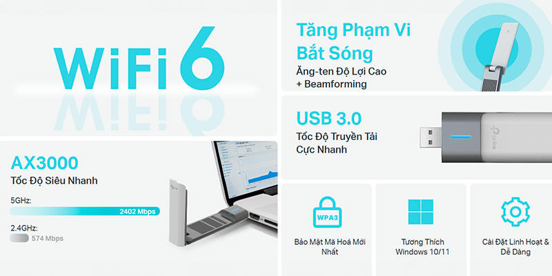 USB WiFi TP-Link Archer TX50UH WiFi 6 AX3000 Archer-TX50UH mang đến tốc độ kết nối ấn tượng với chuẩn WiFi 6, cung cấp tốc độ lên đến 2402 Mbps trên băng tần 5GHz và 574 Mbps trên băng tần 2.4GHz. Sự kết hợp giữa băng tần kép và công nghệ OFDMA giúp giảm độ trễ, tối ưu hóa hiệu suất mạng khi làm việc, giải trí hoặc chơi game trực tuyến. Tốc độ WiFi nhanh gấp 3 lần so với WiFi 5, đảm bảo truyền tải dữ liệu ổn định ngay cả trong môi trường mạng đông đúc.