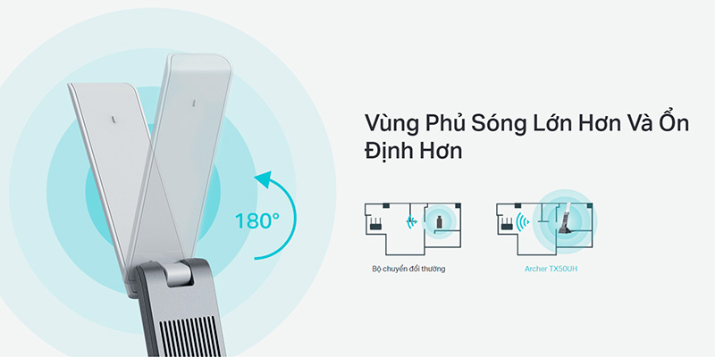 Với hai ăng-ten rời công suất cao, USB WiFi TP-Link Archer TX50UH WiFi 6 AX3000 Archer-TX50UH giúp tăng cường khả năng thu sóng, giảm thiểu tình trạng mất kết nối và đảm bảo tốc độ mạng luôn ổn định. Thiết kế linh hoạt giúp người dùng dễ dàng điều chỉnh hướng ăng-ten để tối ưu hóa tín hiệu, phù hợp với nhiều không gian sử dụng khác nhau.