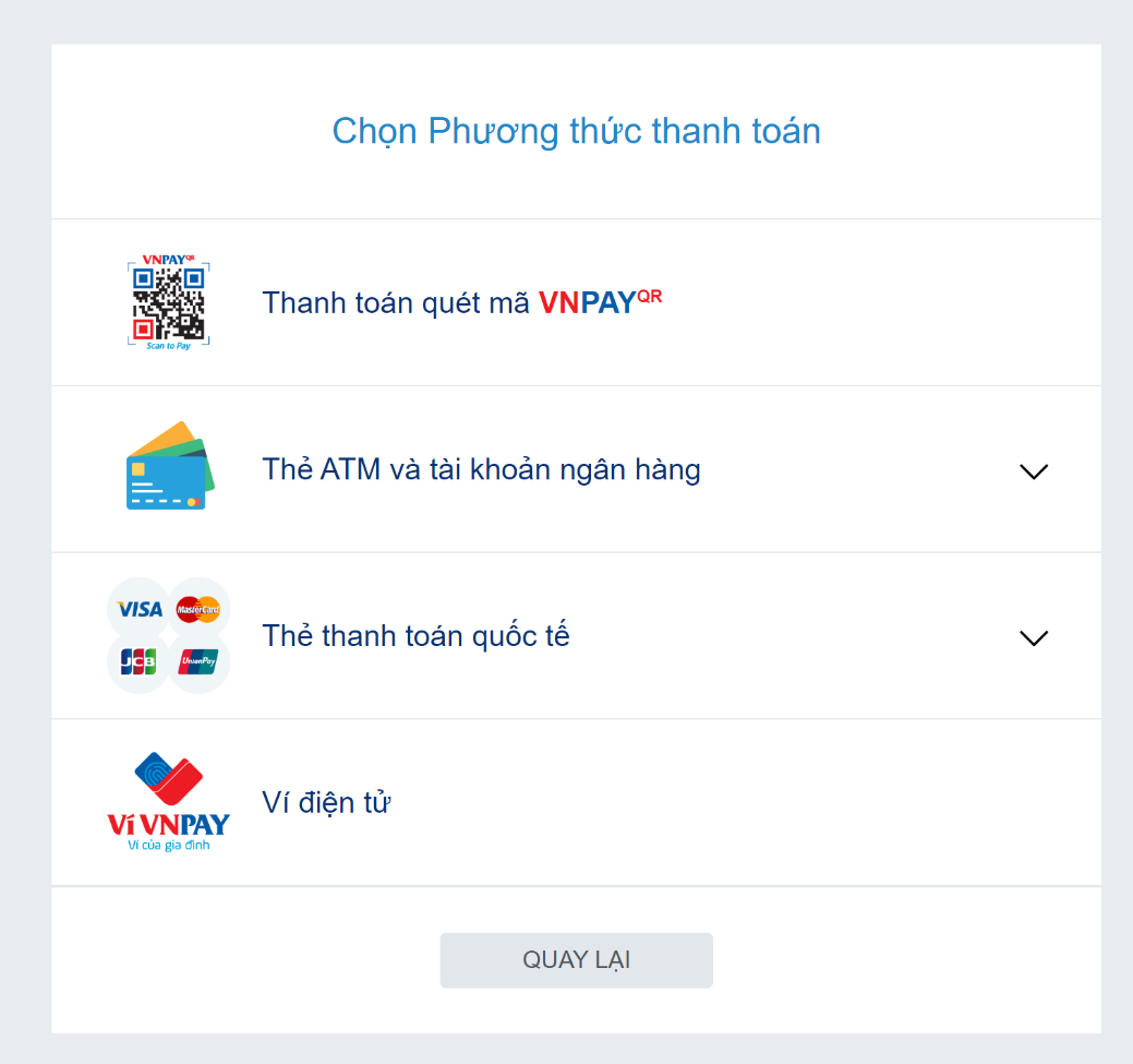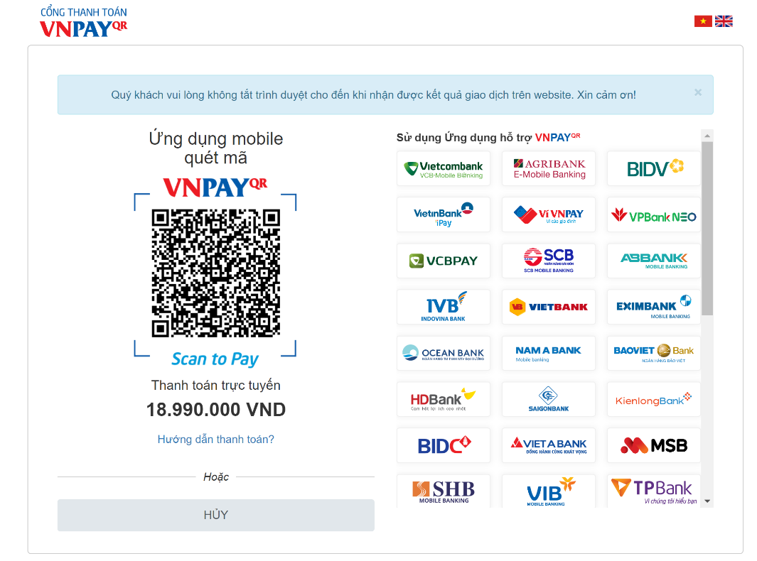 - Quý khách không tắt trình duyệt hoặc chuyển sang Trang khác nếu chưa được xác nhận thanh toán Thành công.