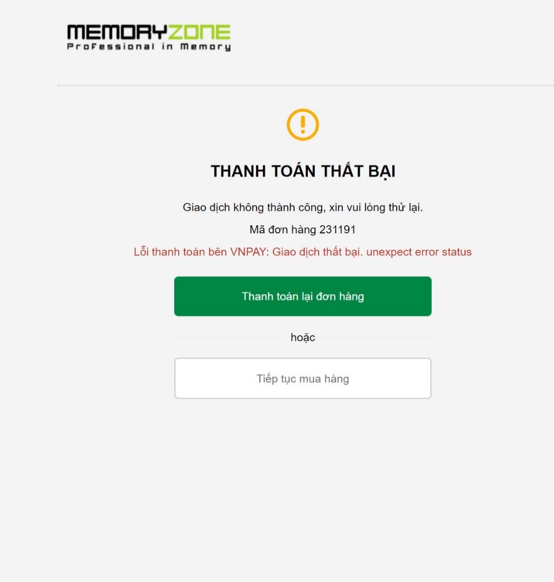 - Trường hợp thanh toán bị lỗi, vui lòng thanh toán lại đơn hàng hoặc liên hệ Memoryzone 02873013878 để được trợ giúp.